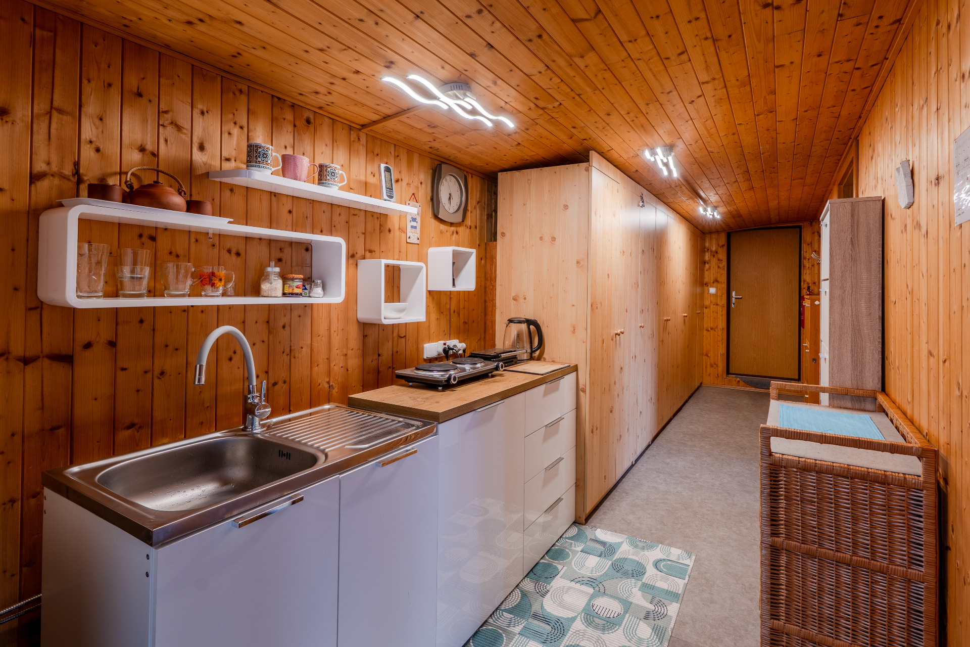 kuchyňský kout, mikrovlnka, rychlovarná konvice, dvouplotýnkový vařič, koupelna s vanou, umyvadlem, ručníky a WC, knihovna, herna- různé NERF zbraně, společenské hry stůl, židle, povlečení,